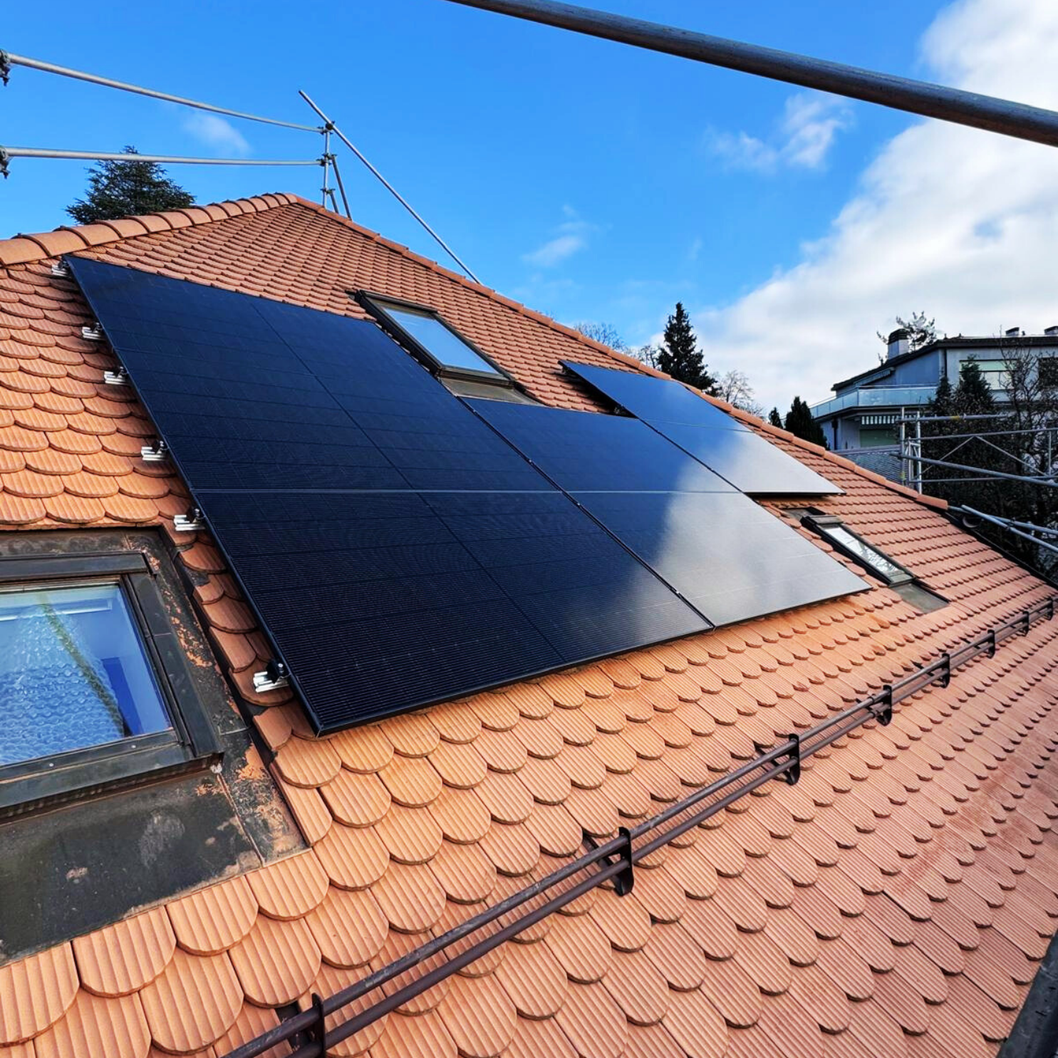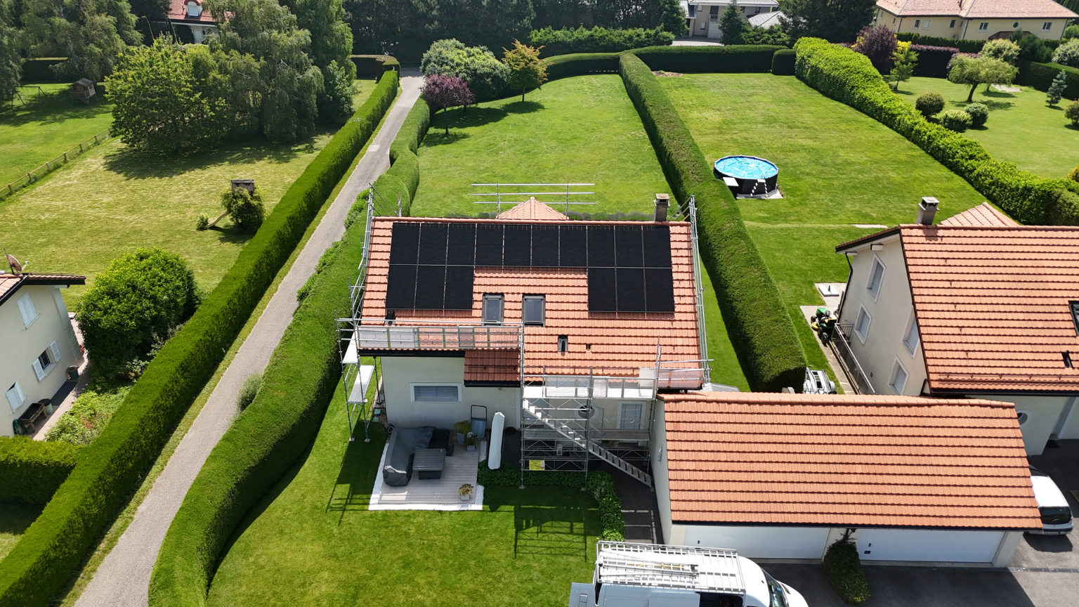 À Lausanne, cette nouvelle construction a intégré le photovoltaïque dès le départ — avec une batterie de stockage pour maximiser chaque kilowattheure produit. Le résultat : un foyer qui consomme en priorité sa propre énergie, et qui ne subit plus les variations du prix du réseau.